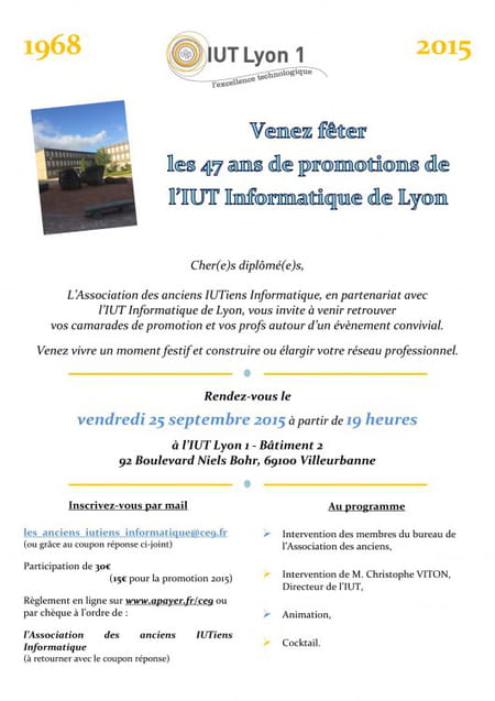 L'Associations des Anciens Iutiens Informatique, en partenariat avec l'IUT Informatique de Lyon, vous invite à venir retrouver vos camarades de promotion et vos profs autour d'un évènement convivial.