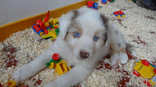 Beau chiot , je pense qu'il s'agit d'un rouge merle , juste un conseil que vous accepterez ou pas , les jouets pour enfant sont à proscrire , en effet un chiot a pour habitude de mordiller et pourrait avaler une pièce d'un jouet qui occasionnerait une occlusion ou des blessures de l'appareil digestif , le mieux( car un chiot fait aussi ses dents ) est de lui donner un os en peau de buffle.