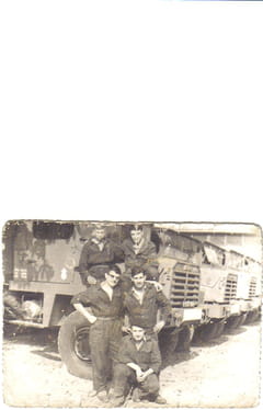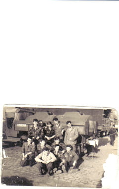 Roland CAUSSÉ au garage a landau avec moi en haut a gauche -roland nidercorn en haut a droite -dupré je ne sais plus le prénon en bas a gauche -a droite je ne sais pas -et accroupi granjean