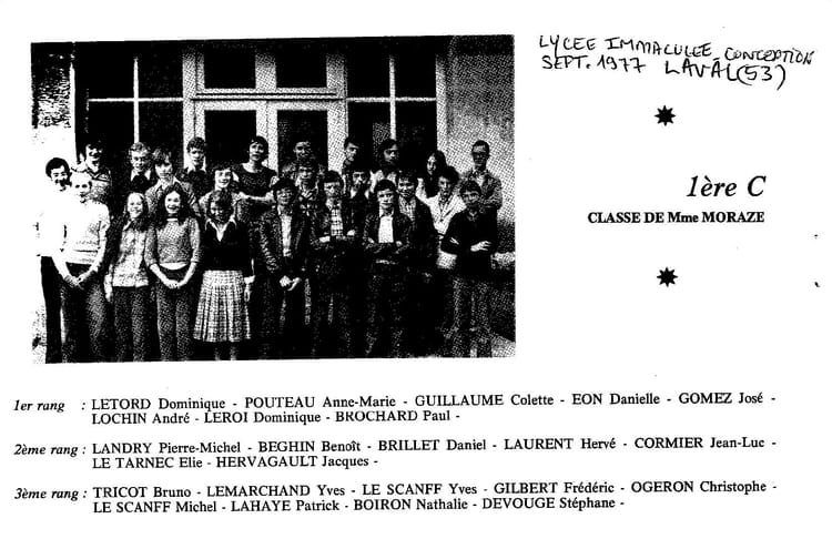Naviguez en cliquant sur la photo. 1977 - 1ere C - Lycée de l'immaculée conception lycée Immaculée Conception Sur la photo Daniel BRILLET Jean-Luc CORMIER Signaler un abus