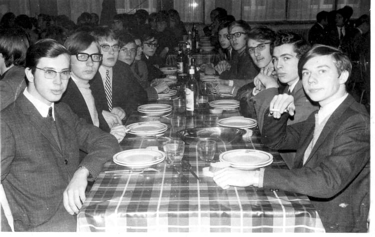 Naviguez en cliquant sur la photo. 1970 - 1èreS - Eng lors du repas de fin d'année, avant les vacances de Noël... Sur la photo Jean-Pierre PENIN Rene DEROSIAUX Jean-Patrice MATYSIAK Signaler un abus