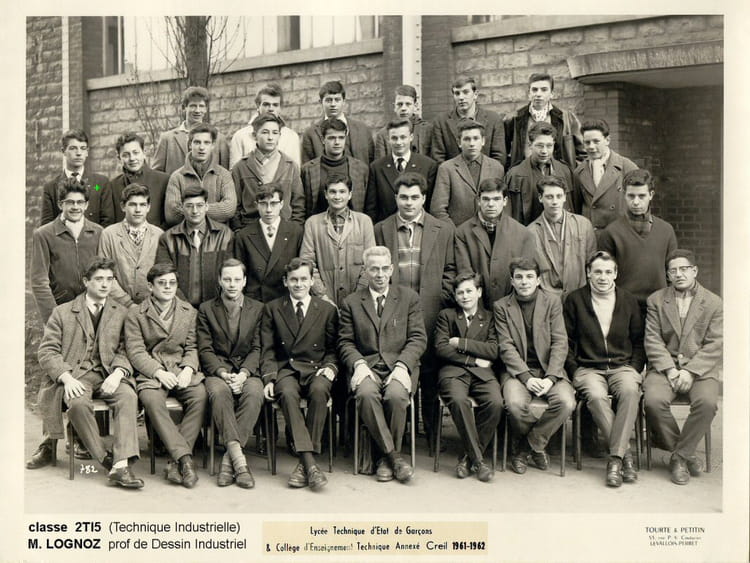 Naviguez en cliquant sur la photo. 1961 - 2 Technique 5 - Lgt (lycée général et technique - anciennement enp puis lte) 1961-1962 de GàD : 1erR : ROHR - VERHAEGUE - FENAILLE - LEBLANS D - prof - POIREE G - GAUBICHER - DEPARIS - ? 2eR : PICHARD - DODRET - AGNESE - VAN DER BIEST - ROUYER - VILLAIN - DELACOTTE - HUBERTIN - NEKKACHE 3eR : GC - LUC - GOBAIN - ? - BITTON - DREVILLE G - JUGE - LANDES - VERET 4eR : DUPONT - BAZARD - CARON - FINANCE - ANDERMATT - ? Sur la photo Pierre LANDES Serge DUPONT Serge DUPONT Signaler un abus