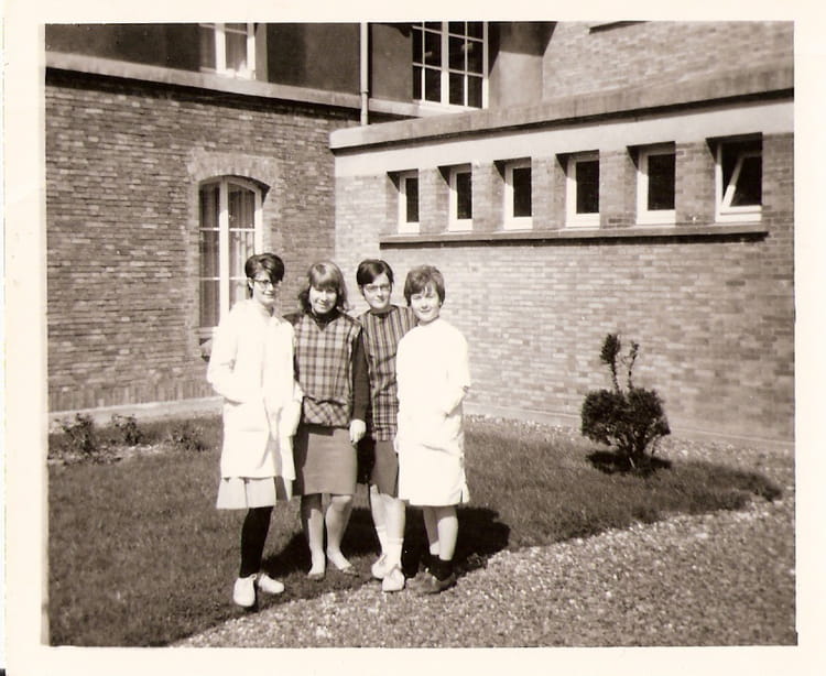 Naviguez en cliquant sur la photo. 1965 - 2E - Enf devant l'infirmerie je crois . ? , Roselyne L., Martine , Annie C. Sur la photo Aucune personne identifiée. Signaler un abus