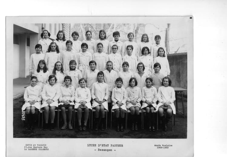 Naviguez en cliquant sur la photo. 1969 - 5 ème - Lycée pasteur Année scolaire 1968-1969.La photo est en noir et blanc, mais je suppose que l'on devait être en semaine rose, d'après les blouses! Sur la photo Bernadette MANSOT Brigitte BRELIER Signaler un abus