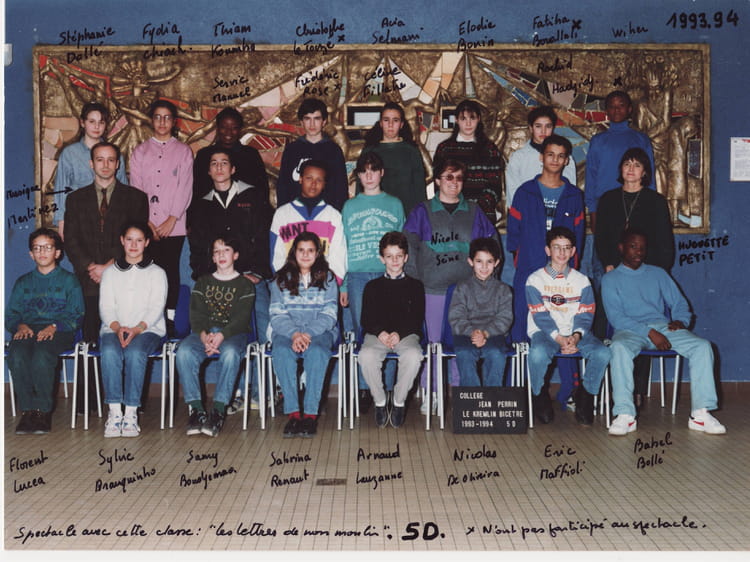 Naviguez en cliquant sur la photo. 1993 - 5D - Collège jean perrin Ces élèves participeront au spectacle:LETTRES DE MON MOULIN d'Alphonse Daudet. Sur la photo Florent LUCÉA Huguette PETIT Racheton HADJ Signaler un abus