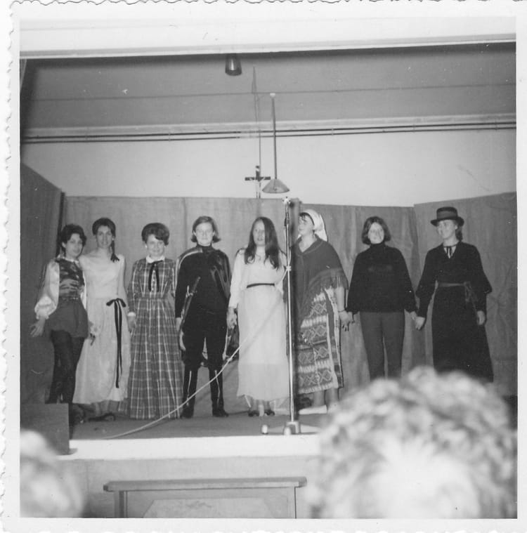 Naviguez en cliquant sur la photo. 1964 - BEL ORME - Lycée professionnel bel orme Récital de poésie. de gauche à droite, moi, Nicole MANCUSO, Françoise RAYNAL (je crois), Marie-Martine (nom de famille oublié), ?, ?, Brigitte FEUILLAN et Christine KELLER Sur la photo Claudie LAJUGIE (SOPPELSA) Signaler un abus