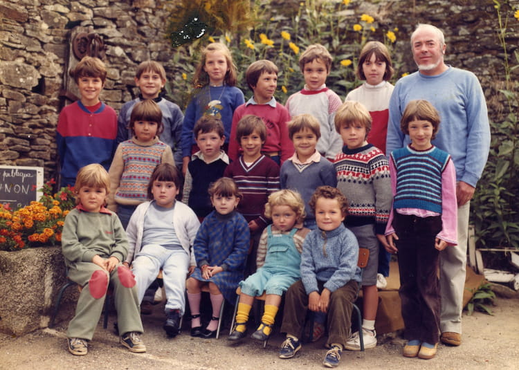 Naviguez en cliquant sur la photo. 1983 - CE2 - Ecole publique Sur la photo Christophe CHAUSSY Gaetan CHAUSSY Anne QUEVAREC Yves MELL Signaler un abus