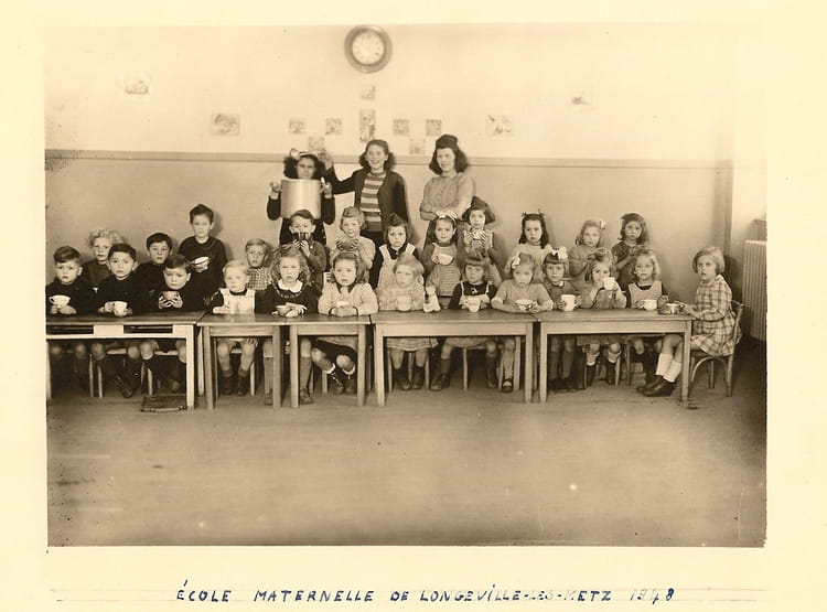 Naviguez en cliquant sur la photo. 1948 - Ecole maternelle Longeville les Metz - école primaire Distribution de lait Sur la photo Hubert GUERARD Signaler un abus