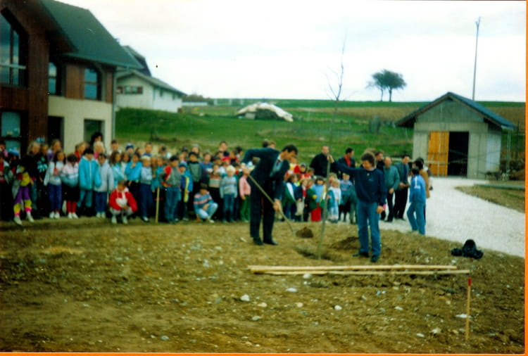Plantation du tilleul par monsieur le maire, André Berthet en présence de madame Michèle Perrissoud, directrice de l'école, les élus de la commune ainsi que les élèves de l'école.