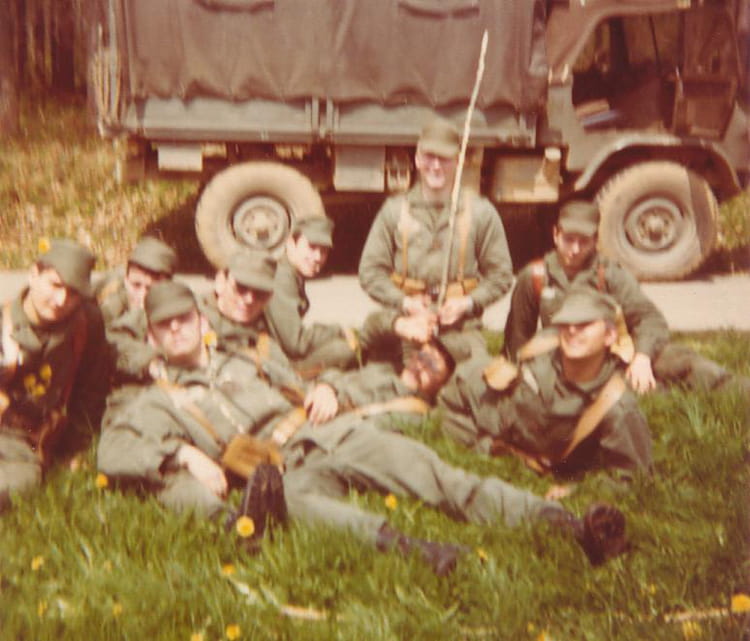 Naviguez en cliquant sur la photo. 1979 - En manoeuvre - 1er régiment de commandement et de soutien je suis au centre avec des lunettes noires Sur la photo Jean-Charles DUPONT Signaler un abus