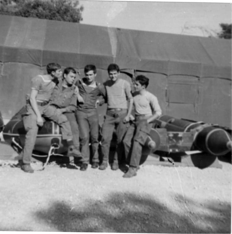 Naviguez en cliquant sur la photo. 1974 - Equipage du cdo hubert - Commando hubert près du dépot des zodiacs Sur la photo Christian NICOLA Signaler un abus