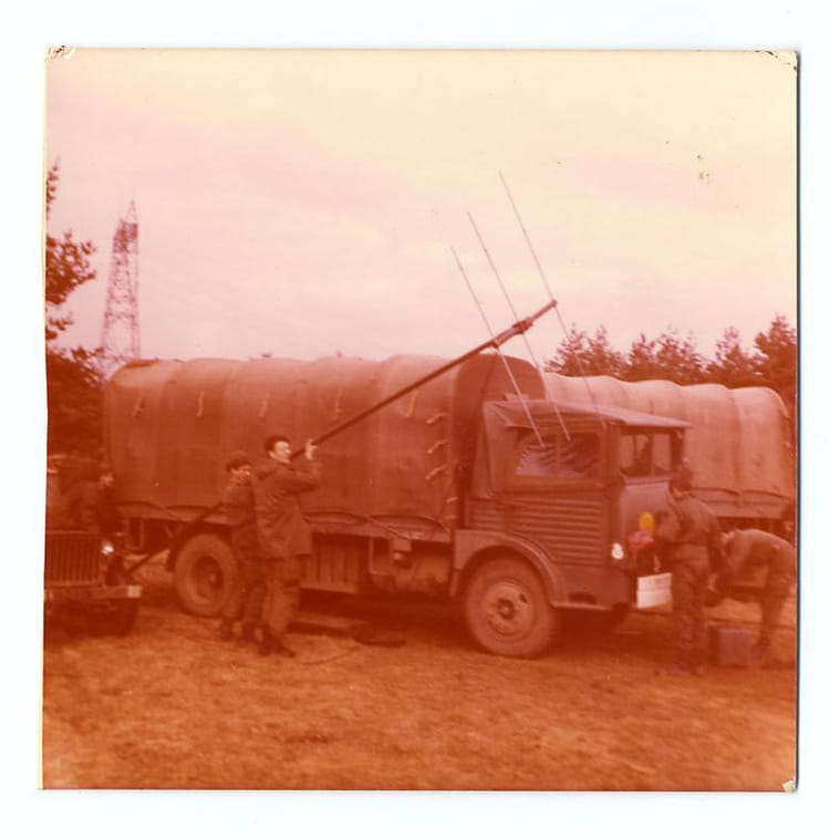 Naviguez en cliquant sur la photo. 1974 - Installation d'une antenne yagi - 18eme regiment d'instruction des transmissions lors de manoeuvres en rase campagne on installait une station radio pour relayer des messages audio en language Québec Sur la photo Pierre DESMETTRE Signaler un abus