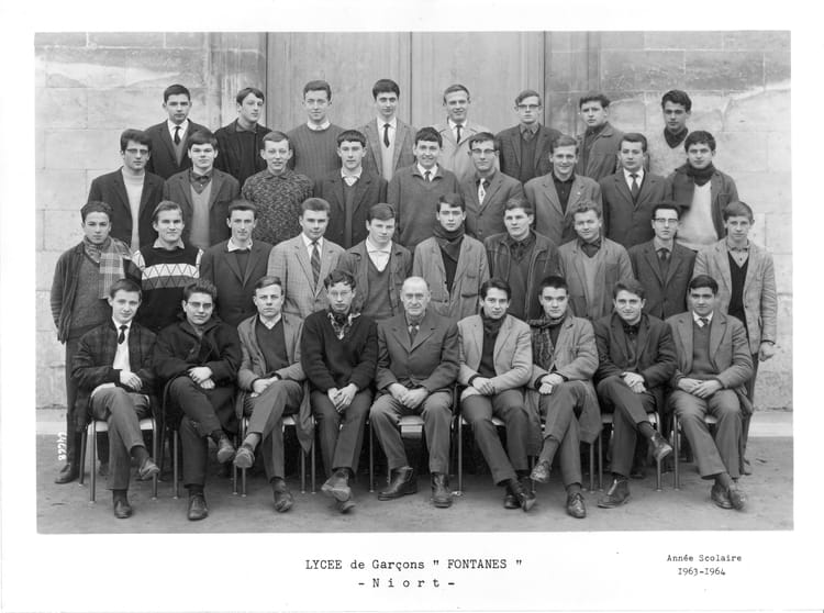Guy YARDC'est bien "Papy", il a du prendre sa retraite pas longtemps après. Il était aussi maire de Sainte Neomaye. La Rosa est bien pied-noir. Nous étions trois dans ce cas, le troisième étant Gestas au premier rang. Si tu étais en Math-Elem en 1963, tu dois connaître Moreau, au deuxième rang. C'était le meilleur sprinter du lycée et du Stade Niortais :-). Tu ne connais peut-être pas Pillard au dernier rang, mais tu as forcément connu son père qui était prof d'histoire géo des classes de 1ère. Au 3ème rang il y a aussi Naud, fils de notre prof de math de terminale...