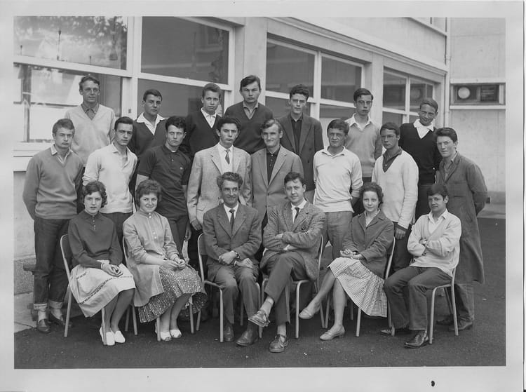 Guy LECOUVETTELe second enseignant était notre professeur de physique, je pense avoir le nom dans mes papiers. D'autre part je reconnais Siegler au 3° rang le 7° de G à D, puis Massin au 3° rang le 1° à G. Au 2° rang en 3° position Van Dongen. A ma droite je pense que c'était Pierson qui est entré à la Comédie Française sauf erreur.J'essaie de retrouver les autres noms, car quand j'avais la pièce de Marivaux au théatre de Deauville, de nombreux camarades en étaient . Cela ne nous rajeunit pas. Amitiés Guy Lecouvette.