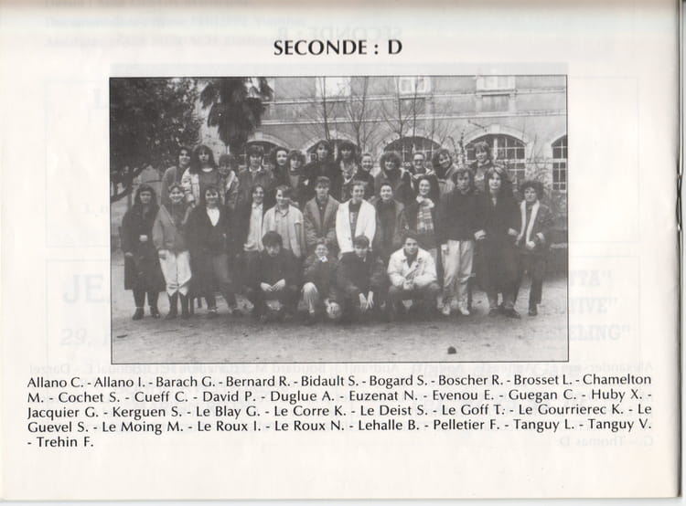 Naviguez en cliquant sur la photo. 1987 - Seconde D - Lycée joseph loth Sur la photo Christelle LEVEQUE (ALLANO) Franck TREHIN Nathalie LAUNAY (LE ROUX) Stephane LE GUEVEL Signaler un abus