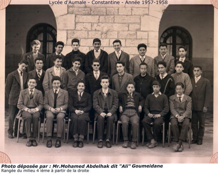 Jean-Pierre PEYRAT D'après une photo parue dans la revue Ensemble, voici les noms des élèves présents sur la photo qui sera publiée également sur les ite de l'ALYC Anciens des Lycées et Collèges de ConstantineArray : Rang 3 : 1. HASSAM Henri 2. BOUGHIDA Kamel 3. CHAMFRAULT 4. GRIMA Georges 5. LETREUX Philippe 6. KRIEF Jean-Claude 7. MESGUICH Pierre 8. DARMON Guy