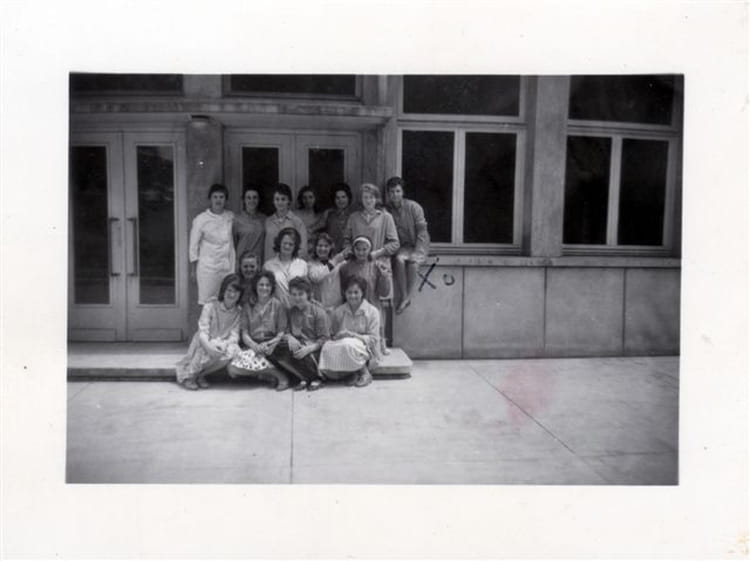 Odette GRIPOIX (ROUSSIN) en bas G à D : 1 Liliane Follot, 2ème , 3ème ?? 4 ème Yvette Bon 2ème rang : 1ère Martie Thérèse Guittet, 2ème ? 3ème annie Fautré, 4ème Josette Trésillard, 3 ème rang : 1 ère Anne Marie Macaire, 2ème ? 3ème: Monique Sirdey, 4 ème Josiane Rougy, 5ème Michèle Billot, 6ème ...Roland, 7ème Odette Roussin