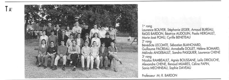 Naviguez en cliquant sur la photo. 1992 - TA' - Lycée notre-dame de bonnes nouvelles Sur la photo Alexandre CHENE Sonia COUSSEAU (MÉCHINEAU) Leila DRIOUCHE Sonia COUSSEAU (MÉCHINEAU) Signaler un abus