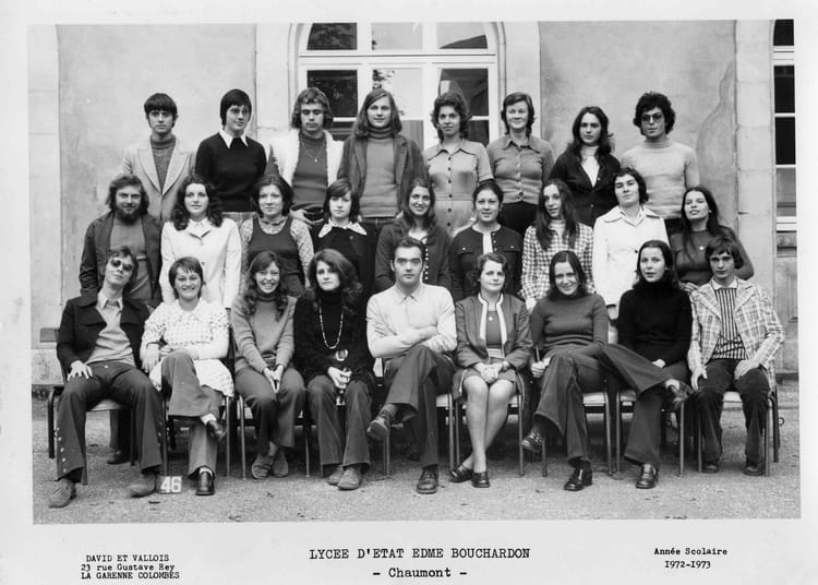Naviguez en cliquant sur la photo. 1973 - TerminaleA5 - Lycée e bouchardon Une bonne équipe ... dont on aimerait avoir des nouvelles ! Ma veste doit avoir été empruntée à Colette, située derrière moi ... Sur la photo Sylvie BRYANT Alain COLLADANT Dominique PIERRE Signaler un abus