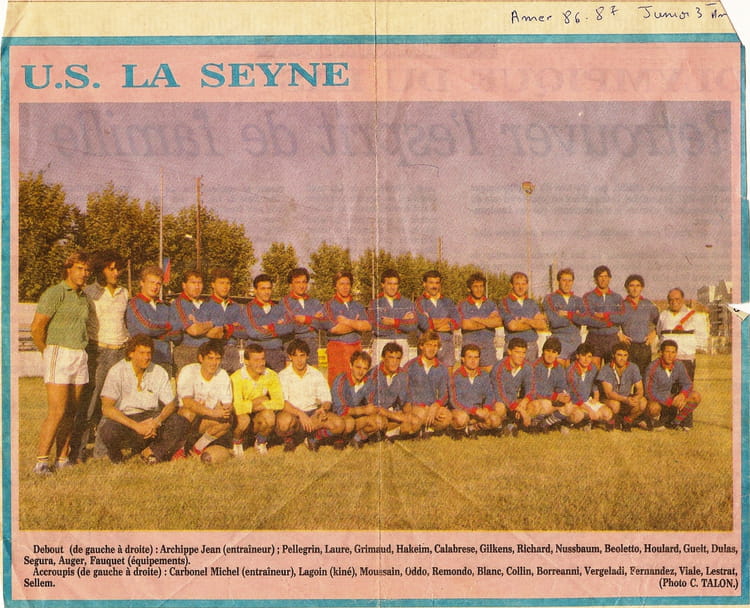 Naviguez en cliquant sur la photo. 1986 - Uss1 - Us seynoise Sur la photo Akim GUADDACHA Gerard MOUSAIN Jean François GILKENS Jean-Louis LAURE Jean Marc COLLIN Miguel MOULARD Philippe VERGELADI Signaler un abus